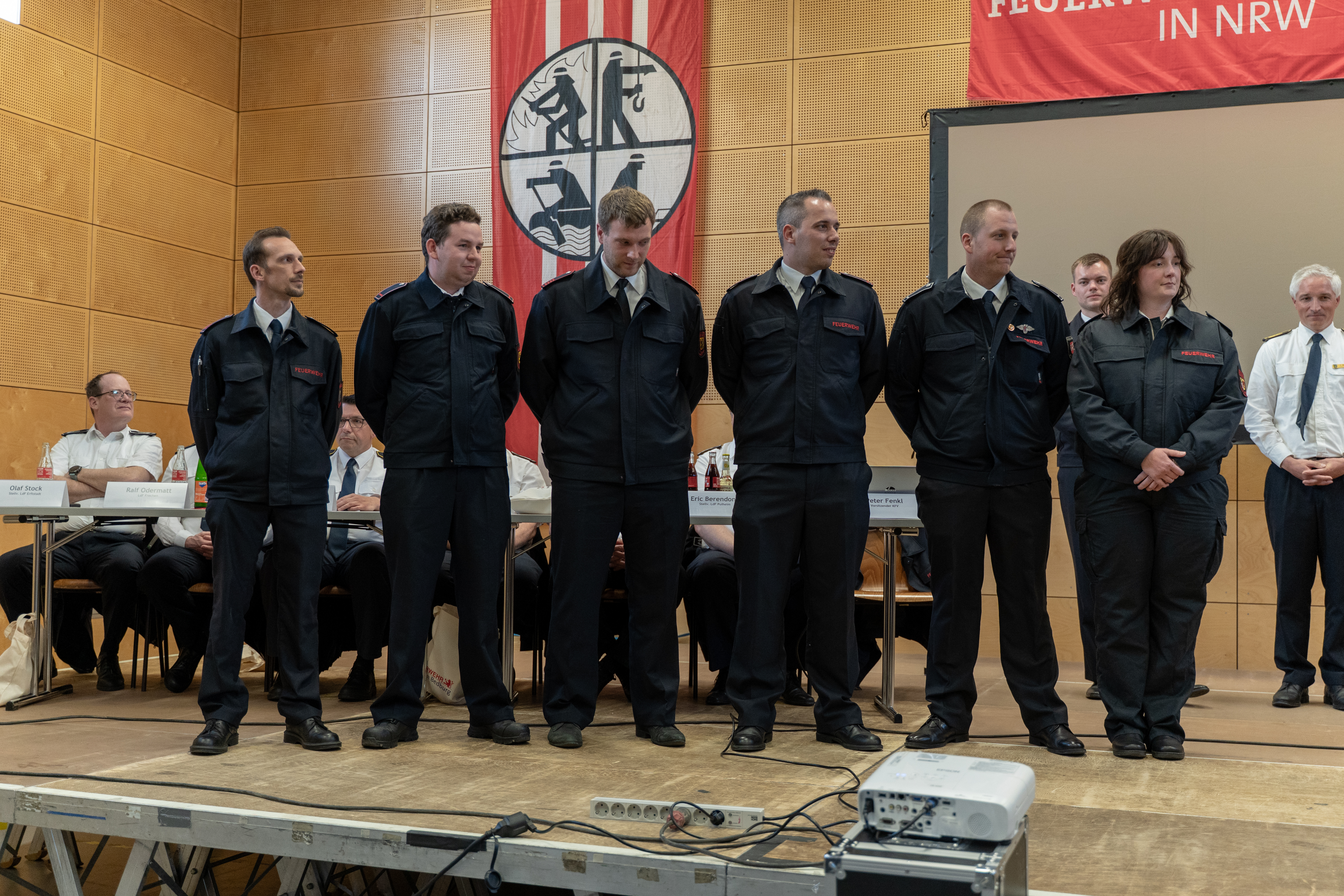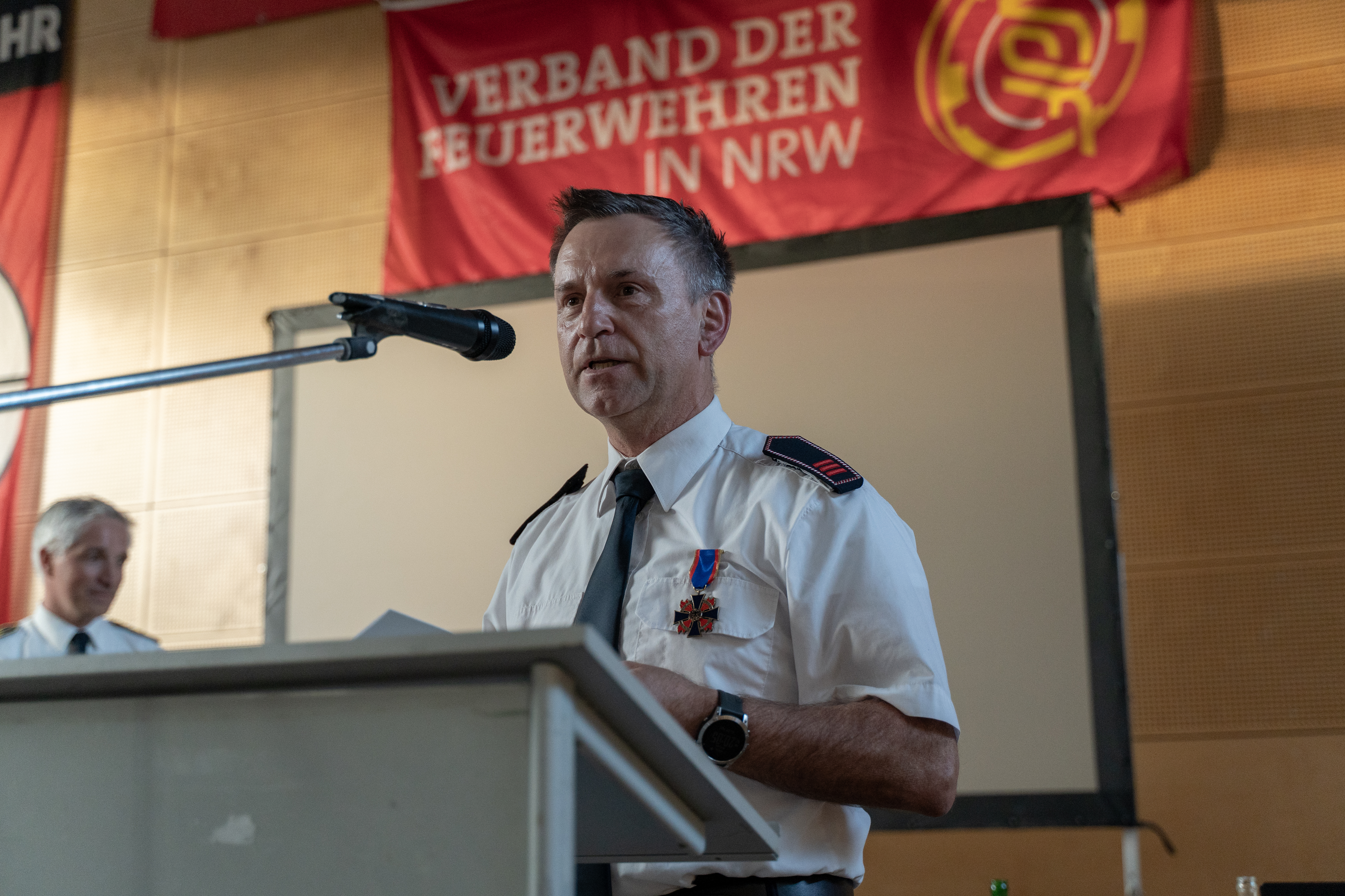 Kreisbrandmeister Thomas Weiler eröffnete die Veranstaltung und begrüßte neben den Feuerwehrangehörigen zahlreiche Ehrengäste – unter anderem aus Politik und Verwaltung. Unter ihnen waren auch Landrat Frank Rock und Dezernent Martin Gawrisch. Ebenfalls vertreten waren Hilfsorganisationen, THW, Bundeswehr, Werkfeuerwehren sowie benachbarte Feuerwehren. Auch der Vorsitzende des Verbandes der Feuerwehren Nordrhein-Westfalen Christoph Schöneborn und Ministerialrat Bernd Geßmann waren der Einladung gefolgt.