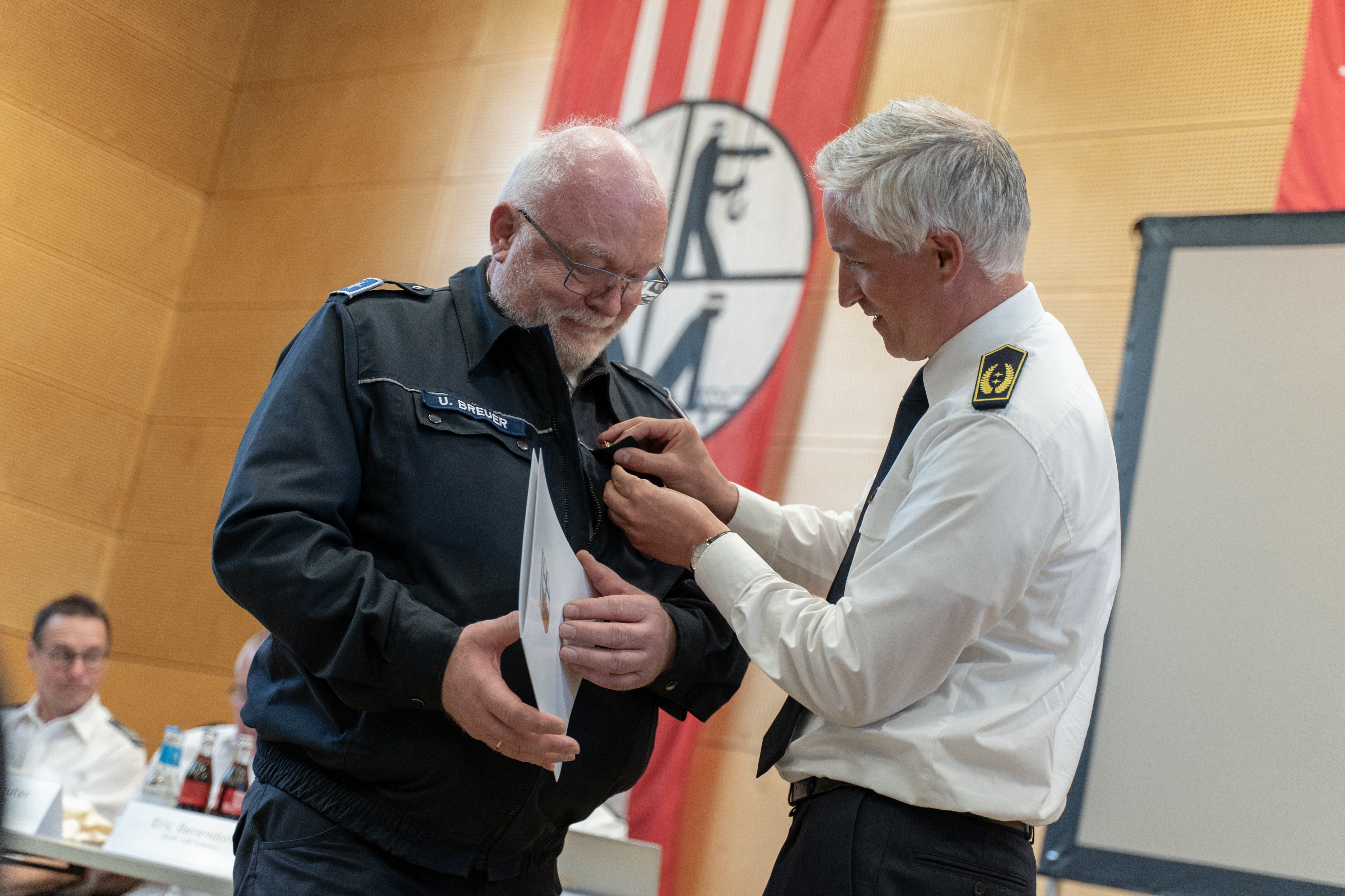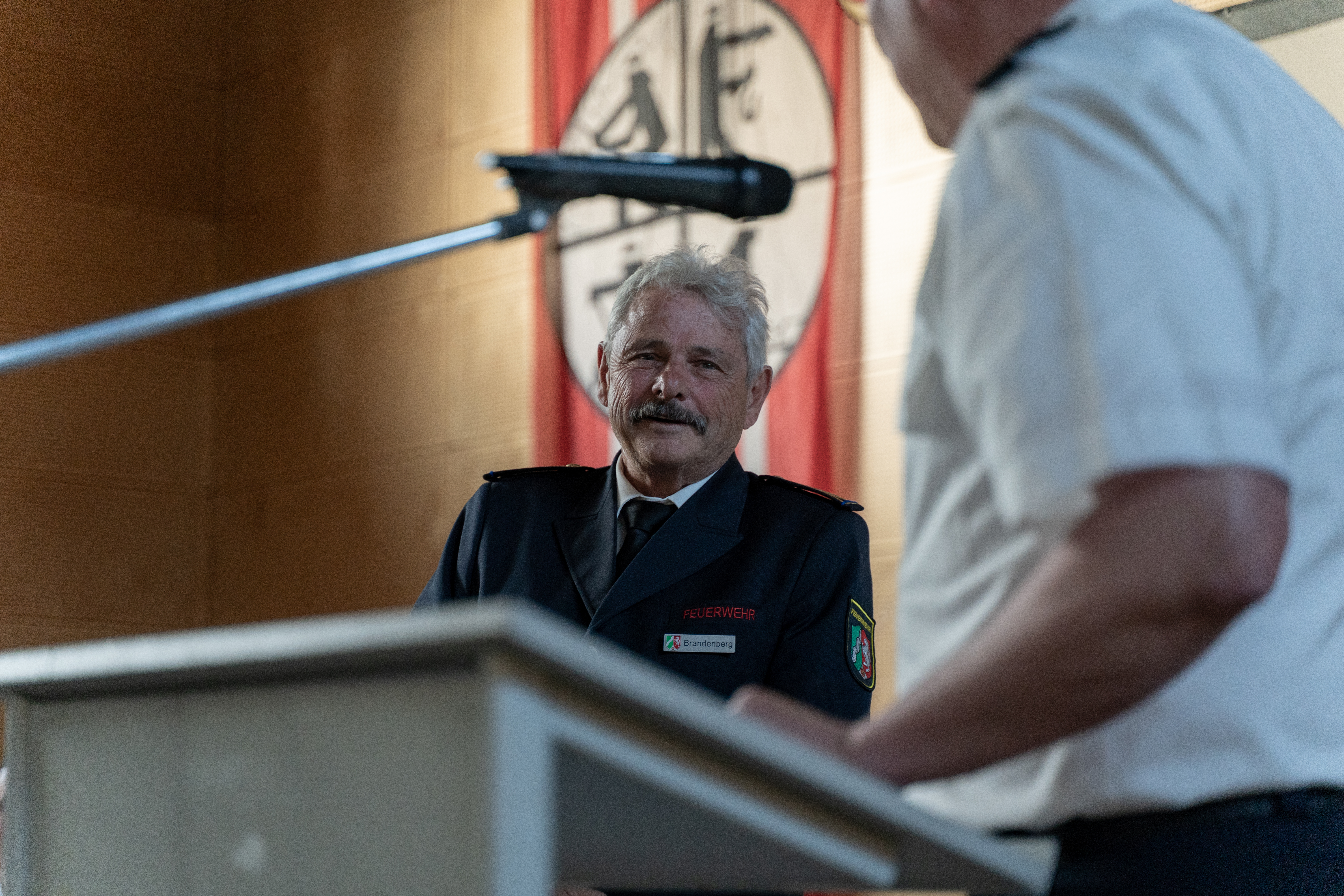 Heinz-Peter Brandenberg erhielt die Ehrennadel des Kreisfeuerwehrverbandes für seine Verdienste auf Kreis-, Bezirks- und Landesebene. Auch Udo Breuer (Johanniter-Unfallhilfe) erhielt für die gute Zusammenarbeit im Bevölkerungsschutz die Ehrennadel des Verbandes.